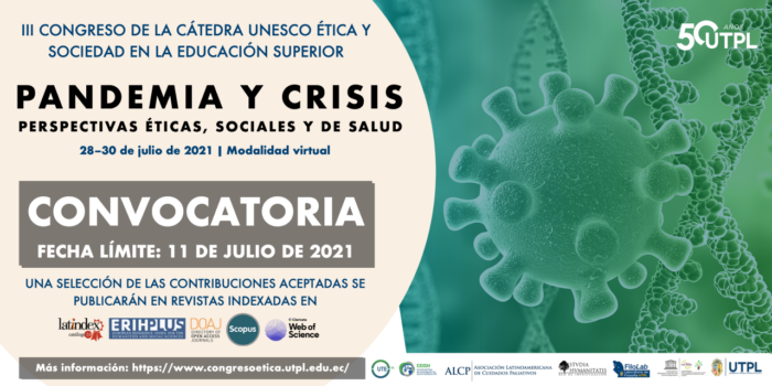 La Cátedra UNESCO de Ética y Sociedad en la Educación Superior de la Universidad Técnica Particular de Loja (UTPL), en colaboración con la Facultad de Ciencias de la Salud, la Carrera de Religión y el FiloLab de la UTPL, el CEISH de la Universidad UTE, la Red de Investigación «Studia Humanitatis», invitan a la comunidad académica (profesores e investigadores) a presentar contribuciones teóricas, históricas o metodológicas en el III Congreso de la Cátedra UNESCO «Pandemia y crisis. Perspectivas éticas, sociales y de salud» que se llevará a cabo en formato virtual entre el 28 y el 30 de julio de 2021, en la ciudad de Loja (Ecuador), con el objeto de estimular el desarrollo e intercambio de la investigación sobre los problemas de la ética en el contexto de la pandemia.