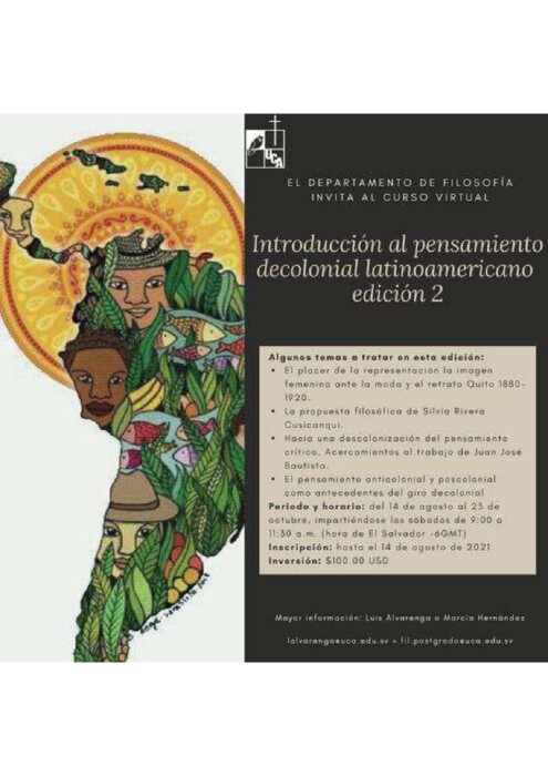 El Departamento de Filosofía de la Universidad Centroamericana José Simeón Cañas (UCA) de El Salvador ofrece la segunda edición del curso virtual «Introducción al Pensamiento Decolonial Latinoamericano».