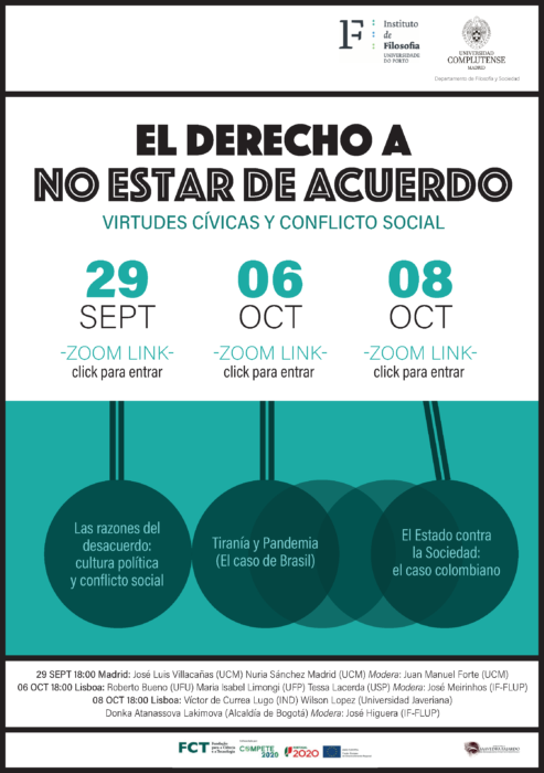 El Ciclo de mesas redondas «El derecho a ‘no estar de acuerdo’. Virtudes cívicas y conflicto social» está organizado por el Departamento Filosofía y Sociedad de Facultad de Filosofía de la UCM y el Instituto de Filosofía de la Universidade do Porto.