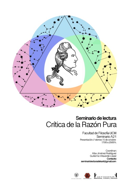 Este seminario está avalado por el proyecto La deducción trascendental de las categorías: nuevas perspectivas, bajo la tutela de Alba Jiménez, como por el proyecto El filósofo, la ciudad y el conflicto de las facultades, bajo la tutela de Guillermo Villaverde. Su presentación será el 15 de octubre a las 17h en la Facultad de Filosofía de la UCM. De esta sesión se encargará Juan Manuel Navarro Cordón, haciéndose cargo de los dos prólogos de la KrV, presentada por Alba Jiménez y Marco Díaz Marsa.