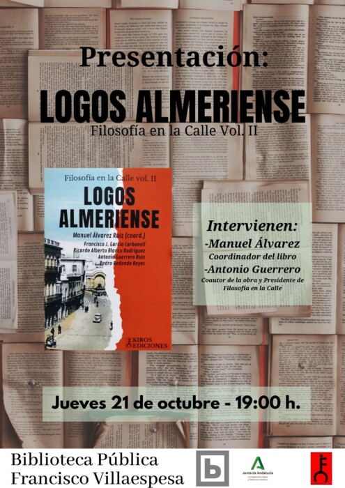 La presentación del segundo volumen de Filosofía en la Calle, Logos almeriense, tendrá lugar el p´roximo jueves 21 de octubre a las 19:00 en la Biblioteca Pública Francisco Villaespesa (Almería). Contará con las intervenciones de Manuel Álvarez, coordinador del libro, y Antonio Guerrero, coautor y presidente de Filosofía en la Calle.