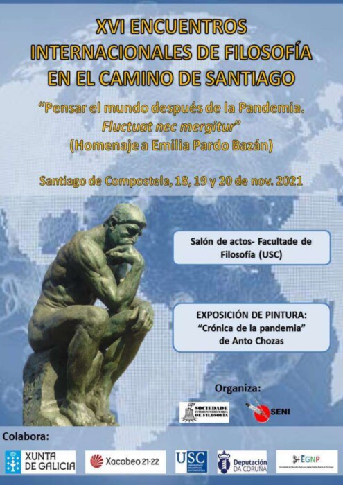 Los XVI Encuentros Internacionales de Filosofía en el Camino de Santiago, dedicados al tema «Pensar el mundo después de la pandemia», se celebrarán del 18 al 20 de noviembre de 2021 en la Facultad de Filosofía de la USC. Programa completo disponible en el siguiente enlace: