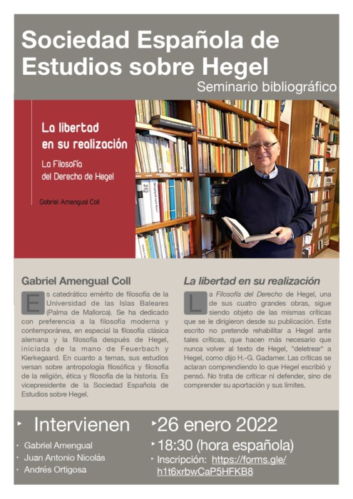 El próximo seminario de la Sociedad Española de Estudios sobre Hegel tendrá lugar el 26 de enero de 2022, a las 18.30 horas (horario europeo). sobre el tema:»La libertad y su realización. La Filosofía del Derecho de Hegel».
