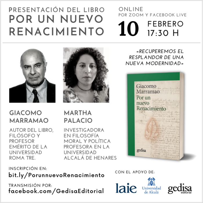 El próximo 10 de febrero a las 17.30h, el filósofo italiano Giacomo Marramao presentará su última novedad, Por un nuevo renacimiento, en conversación con Martha Palacio Avendaño (UAH).