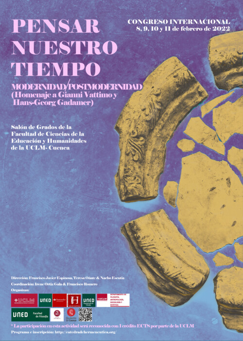 Podéis acceder a toda la Información, Programa e Inscripción (presencial y online; reconocida con un 1 Crédito ECTS por la UCLM) de este evento a través de la Cátedra HERCRITIA: https://www.catedradehermeneutica.org/pensar-nuestro-tiempo-modernidad-postmodernidad/