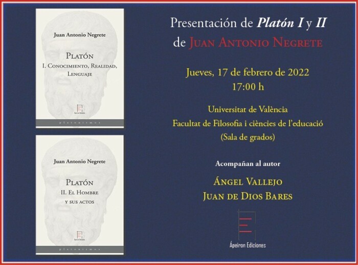 El jueves 17 de febrero a las 17 horas tendrá lugar la presentación del libro Platón (I y II) de Juan Antonio Negrete, en la Sala de Grados de la Facultad de Filosofía y CCEE de Valencia.