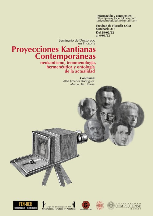 El día 28 de Febrero comienza el Seminario de Doctorado Proyecciones kantianas contemporáneas: neokantismo, fenomenología y ontología de la actualidad, coordinado por Alba Jiménez y Marco Díaz Marsá bajo la colaboración de los Proyectos de Investigación La hermenéutica fenomenológica en el contexto de la filosofía trascendental: desde la apropiación hasta su crítica radical dirigido por François Duquette, La deducción trascendental de las categorías: nuevas perspectivas y Esquematismo, teoría de las categorías y mereología en la filosofía kantiana: una perspectiva fenomenológico hermenéutica (Alba Jiménez) y los grupos de investigación Fenomenología y Hermenéutica y Metafísica, Crítica y Política dirigidos respectivamente por los Profesores Ramón Rodríguez y José Luis Pardo.