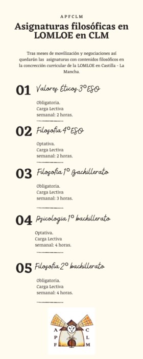 Asignaturas de filosofía en Castilla-La Mancha Campañas Ref Defensa de la Filosofía Secundaria Hay comunidades autónomas SÍ apuestan por la Filosofía, esperemos que el resto de las comunidades sigan su ejemplo Comparte esto: Haz clic para compartir en Facebook (Se abre en una ventana nueva) Facebook Haz clic para compartir en X (Se abre en una ventana nueva) X Haz clic para imprimir (Se abre en una ventana nueva) Imprimir Haz clic para enviar un enlace por correo electrónico a un amigo (Se abre en una ventana nueva) Correo electrónico Haz clic para compartir en LinkedIn (Se abre en una ventana nueva) LinkedIn Me gusta esto:Me gusta Cargando...