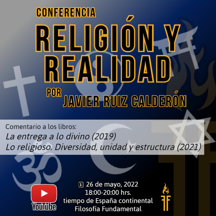 Filosofía Fundamental invita a la conferencia vía streaming sobre Religión y realidad, impartida por el Dr. Javier Ruíz Calderón, en la que nos presentará cómo puede darse la religiosidad desde coordenadas «intramundanas», comentando dos de sus libros, La entrega a lo divino (2019) y Lo religioso. Diversidad, unidad y estructura (2021). La cita es el jueves 26 de mayo de 2022, de 18:00 a 20:00hrs. (tiempo de España continental), a través del canal de YouTube de Filosofía Fundamental. Se tratará de una sesión extraordinaria y abierta del Seminario Permanente de Reología, en la que algunos de sus miembros le acompañarán en el panel.