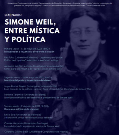 Modalidad online. Toda la información y enlaces de conexión en: http://www.sefarad-israel.es/Seminario_Simone_Weil_entre_m%C3%ADstica_y_pol%C3%ADtica