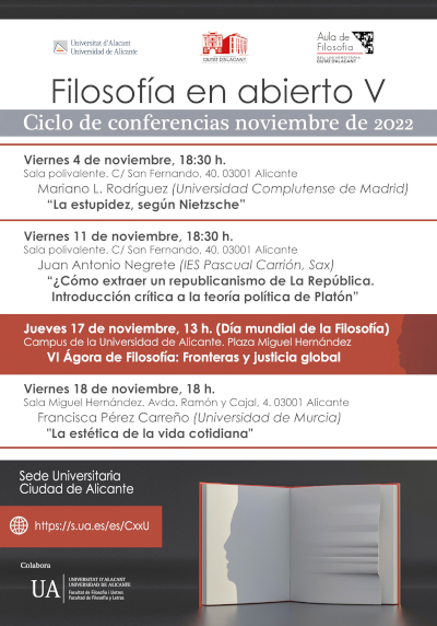 En su quinta edición el ciclo Filosofía en abierto continúa reivindicando la vocación pública del debate filosófico que define la trayectoria del Aula de Filosofía de la Sede Universitaria Ciudad de Alicante. El programa se articula en tres conferencias e incluye la celebración del Día Mundial de la Filosofía.