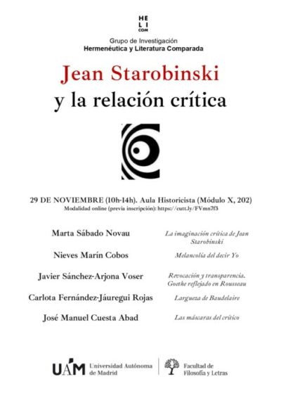 Jean Starobinski (1920-2019) es una de las figuras más destacadas de la teoría y la crítica literarias del siglo XX, y su extensa obra es comparable en profundidad e importancia a las de autores coetáneos como Roland Barthes, Georges Poulet, Paul de Man, Peter Szondi, Hans Robert Jauss o Tzvetan Todorov. Miembro eminente de la llamada “Escuela de Ginebra”, Starobinski combina magistralmente en sus trabajos las perspectivas fenomenológicas y psicológicas con los análisis estilísticos, la atención a las estructuras textuales y un interés constante por la historia de las ideas. Entre los muchos escritores y artistas a los que ha prestado atención, se cuentan los nombres de Montaigne, Rousseau, Diderot, Mozart, Baudelaire y los de otros pensadores, poetas y narradores de la literatura europea moderna y contemporánea. El Seminario se ocupa centralmente de las aportaciones más relevantes del escritor suizo a la hermenéutica literaria, la teoría de la crítica y la literatura comparada. La ponencia de apertura estará a cargo de una de las mayores especialistas actuales en la obra de Starobinski y la escuela ginebrina, Marta Sábado Novau (Université Catholique de Louvain), autora del libro L’École de Genève (2021). Intervendrán también Carlota Fernández-Jáuregui Rojas (Universidad de Salamanca), Nieves Marín Cobos (Grupo Helicom), Javier Sánchez-Arjona Voser (Grupo Helicom) y José Manuel Cuesta Abad (Helicom-UAM).