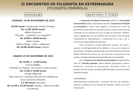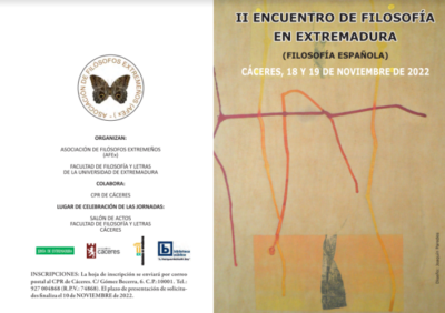Festival Filosofía en Extremadura Actividades Extremadura Festivales de Filosofía II Encuentro de Filosofía en Extrermadura: Filosofía EspañolaEn Cáceres los días 18 y 19 de Noviembre.Organizan:Asociación de Filosofía de Extremadura (AFEx) yLa Facultad de Filosofía y Letras de la Universidad de Extremadura Comparte esto: Haz clic para compartir en Facebook (Se abre en una ventana nueva) Facebook Haz clic para compartir en X (Se abre en una ventana nueva) X Haz clic para imprimir (Se abre en una ventana nueva) Imprimir Haz clic para enviar un enlace por correo electrónico a un amigo (Se abre en una ventana nueva) Correo electrónico Haz clic para compartir en LinkedIn (Se abre en una ventana nueva) LinkedIn Me gusta esto:Me gusta Cargando...