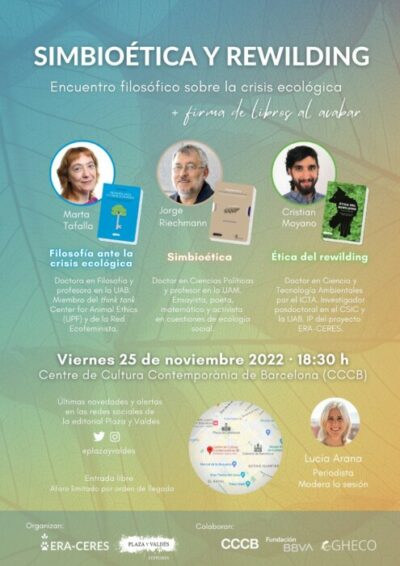 El próximo viernes 25 de noviembre a las 18:30 h. se celebrará en el CCCB (Barcelona) el encuentro con Marta Tafalla, Jorge Riechmann y Cristian Moyano para compartir ideas acerca del desafío que representa la crisis ecológica que estamos viviendo. El abordaje de la cuestión se llevará a cabo desde las posiciones teóricas que los tres participantes han desarrollado durante su trayectoria académica e intelectual, en los tres casos con un pie puesto en la filosofía y otro en el ecologismo.