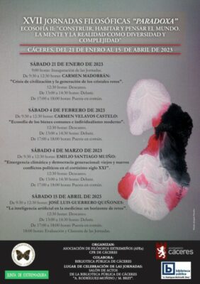 XVII Jornadas filosóficas “PARADOXA” Actividades Congresos y Jornadas Extremadura Jornadas Jornadas organizadas por la Asociación de Filósofos Extremeños (AFex) Ecosofía II: construir, habitar y pensar el mundo. La mente y la realidad como diversidad y complejidad Comparte esto: Haz clic para compartir en Facebook (Se abre en una ventana nueva) Facebook Haz clic para compartir en X (Se abre en una ventana nueva) X Haz clic para imprimir (Se abre en una ventana nueva) Imprimir Haz clic para enviar un enlace por correo electrónico a un amigo (Se abre en una ventana nueva) Correo electrónico Haz clic para compartir en LinkedIn (Se abre en una ventana nueva) LinkedIn Me gusta esto:Me gusta Cargando...
