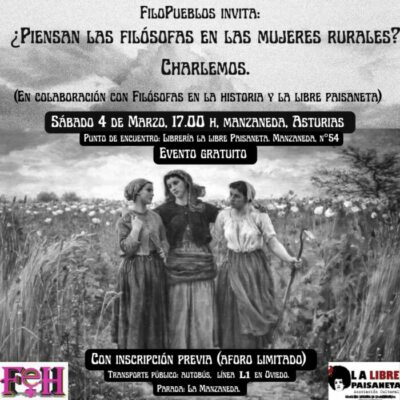 La Red de Filosofía en el Mundo Rural y FiloPueblos elaboran un proyecto de reciente creación con sede en el Principado de Asturias. Su primera actividad oficial tendrá lugar el próximo 4 de marzo de 2023 en la librería rural La Libre Paisaneta en la aldea asturiana de Manzaneda, en el municipio de Oviedo. El evento se realiza en colaboración con Filósofas en la Historia, una iniciativa coordinada por Paz Pérez Encinas. En el evento filosófico de este sábado tendremos el privilegio de contar con la presencia de la coordinadora de este proyecto quien dirigirá una charla sobre la obra de las filósofas sobre las mujeres rurales.