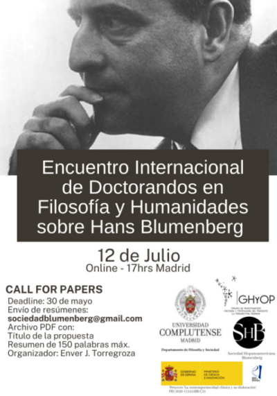 Convocatoria a participar en el primer Encuentro Internacional de Doctorandos en Filosofía y Humanidades sobre el pensamiento de Hans Blumenberg que se desarrollará online el día 12 de julio de 2023. Envío de ponencias antes del 30 de mayo a sociedadblumenberg@gmail.com. Organizado por la Sociedad Iberoamericana Blumenberg, el Grupo de Investigación Historia y Ontología del Presente de la Universidad Complutense de Madrid. Informes en la página web https://sociedadblumenberg.wordpress.com/encuentro-internacional-doctorandos/, o en los correos sociedadblumenberg@gmail.com, Coordinador: Óscar Quintero oscarq911@gmail.com, Organizador: Enver Torregroza (UCM) envtorre@ucm.es