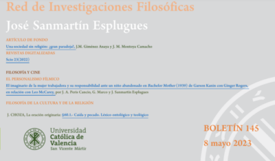 tenemos el placer de enviarles el Boletín nº 145 de la Red de Investigaciones Filosóficas José Sanmartín Esplugues (Proyecto SCIO), con las novedades que han sido ‘subidas’ a la web durante la segunda quincena del mes de abril de 2023: