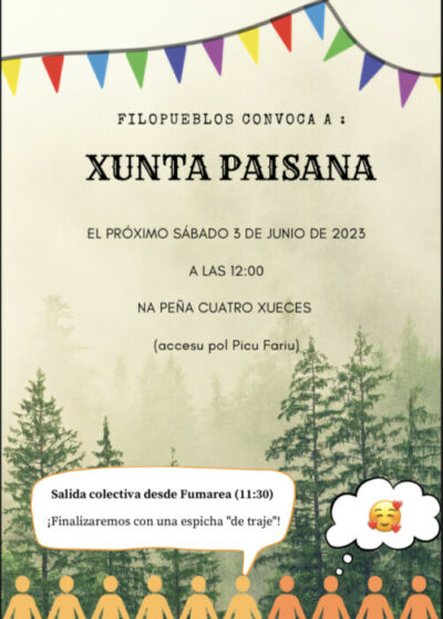 El objetivo de esta actividad es “aprender de nuestro pasado para replantear el futuro de la filosofía política desde el mundo rural”. Por eso convocamos a Xunta Paisana (Asamblea popular), para conocer más de nuestra historia política común, adentrarnos en sus fortalezas y sus debilidades, y debatir algunos de los asuntos claves de nuestra convivencia presente en los pueblos de Asturias. Podéis contribuir a la elaboración del orden del día a través de correo electrónico o de las redes sociales. Gracias de antemano por vuestras aportaciones.
