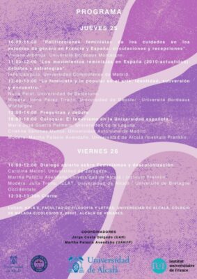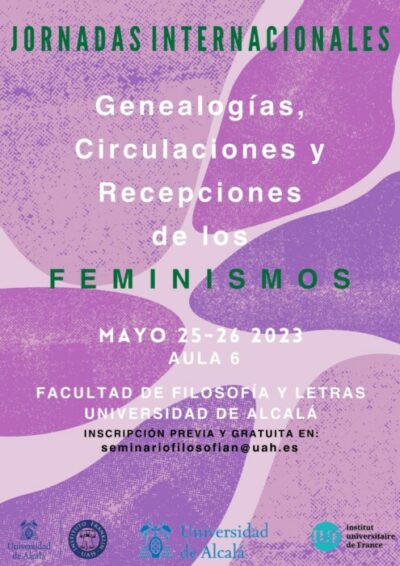 Jornadas «Genealogías, circulaciones y recepciones de los feminismos» Actividades Jornadas Madrid 25 y 26 de mayo Todas las sesiones serán en el Aula 6 de la Facultad de Filosofía y Letras de la Universidad de Alcalá (Colegio de Málaga). Comparte esto: Haz clic para compartir en Facebook (Se abre en una ventana nueva) Facebook Haz clic para compartir en X (Se abre en una ventana nueva) X Haz clic para imprimir (Se abre en una ventana nueva) Imprimir Haz clic para enviar un enlace por correo electrónico a un amigo (Se abre en una ventana nueva) Correo electrónico Haz clic para compartir en LinkedIn (Se abre en una ventana nueva) LinkedIn Me gusta esto:Me gusta Cargando...