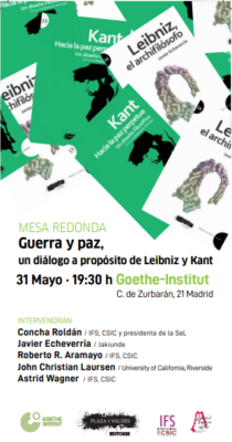 A) Miércoles 31 de mayo 19,30 horas en Goethe Institut. Mesa redonda “Guerra y paz, un diálogo a propósito de Leibniz y Kant”, con la participación de Javier Echeverría, Roberto R. Aramayo, Christian Laursen, Astrid Wagner y Concha Roldán.