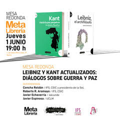 B) Jueves 1 de Junio 19 horas en MetaLibreria. Mesa redonda”Leibniz y Kant actualizados. Diálogos sobre guerra y paz”, con la participación de Javier Echeverría, Roberto R. Aramayo, Javier Espinosa y Concha Roldán.