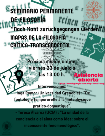 En la sesión del próximo viernes 23 de junio recibiremos virtualmente a la profesora Inga Römer de la Universidad de Grenoble Alpes, con una conferencia titulada «De l’ontologie temporelle à la métaphysique pratico-dogmatique. Kant critique de Heidegger”, y a la profesora Teresa Álvarez que nos hablará de «La unidad de la conciencia o el alma como idea: sobre el inconsciente fenomenológico”.