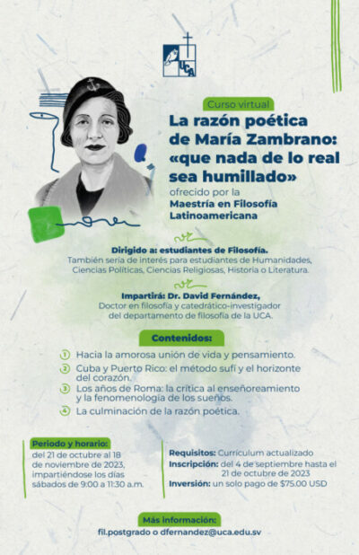 La Maestría en Filosofía Latinoamericana de la Universidad José Simeón Cañas (UCA) de El Salvador ofrece el curso virtual «La razón poética de María Zambrano: “Que nada de lo real sea humillado”».