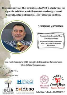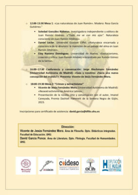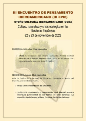 Les hacemos llegar con mucho gusto la información acerca del III Encuentro de Pensamiento Iberoamericano (III EPIb), organizando por la Universidad de Huelva, con apoyo de la Cátedra Juan Ramón Jiménez, la Diputación de Huelva, el COIDESO y la Asociación Cultural Iberoamericana, y enmarcado en los eventos de la 16 edición del Otoño Cultural Iberoamericano. El III EPIb se dedicará a discutir y divulgar temas de gran interés y actualidad, como la crisis ecológica y las relaciones entre problemáticas ambientales y la literatura y ofrecerá unas perspectivas novedosas sobre la obra de Juan Ramón Jiménez. Contaremos con destacadísimos intelectuales y académicos que expondrán conferencias y participarán en Mesas de discusión y disfrutaremos de la presencia del último ganador del Premio Hammett 2023 de Novela negra, que concede la Semana Negra de Gijón.